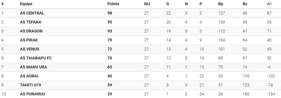 Tahiti Ligue 1 2017-18 Ligue 1 Standings Top Scorers Qualified for 2019 OFC Champions LeagueAS Central SportAS Tefana Compartilhe isso: Share on X (Opens in new window) X Share on Facebook (Opens in new window) Facebook Like Loading...